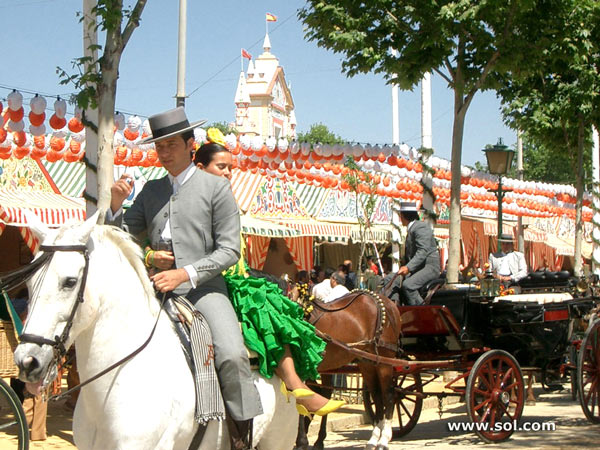 Por la tarde uno no puede perderse el majestuoso paseo de los caballos y enganches. Los hombres vestidos con el típico traje corto, las mujeres con sus trajes de flamenca. La animación en la calle no para en ningún momento, ni de día ni de noche.